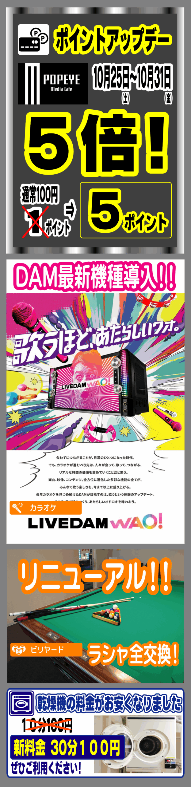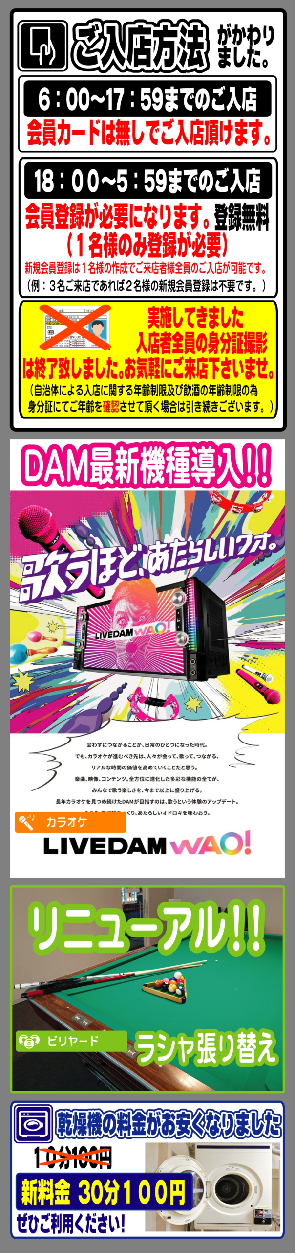 下関市最大級のアミューズメント施設へようこそ!24時間営業のカラオケ施設は周辺地域では当店のみになります。何時でも歌うことが可能です!カラオケルーム内は最大75型の大型ワイドモニターを設置、迫力満点での大熱唱が可能です。他にもネットカフェはもちろん、ビリヤード、ダーツ、スロットコーナーなど多数のコンテンツをご用意致してございます。また、少しの休憩や仮眠でもご不便がございませんようシャワー、ランドリーなど充実した設備もございます。お客様のお越しを心よりお待ち致しております。