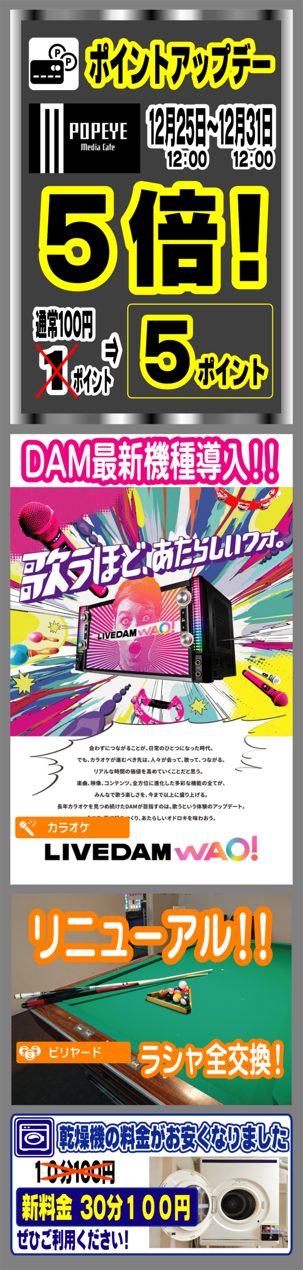 下関市最大級のアミューズメント施設へようこそ!24時間営業のカラオケ施設は周辺地域では当店のみになります。何時でも歌うことが可能です!カラオケルーム内は最大75型の大型ワイドモニターを設置、迫力満点での大熱唱が可能です。他にもネットカフェはもちろん、ビリヤード、ダーツ、スロットコーナーなど多数のコンテンツをご用意致してございます。また、少しの休憩や仮眠でもご不便がございませんようシャワー、ランドリーなど充実した設備もございます。お客様のお越しを心よりお待ち致しております。