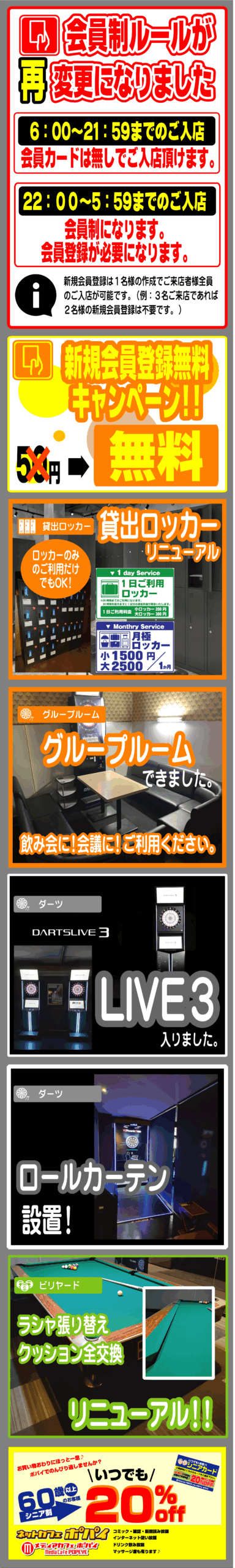 高槻市最大級のアミューズメント施設へようこそ!ネットカフェはもちろん、ビリヤード、ダーツ、スロットコーナー、麻雀格闘俱楽部、など多数のコンテンツをご用意致しております。また、少しの滞在でもご不便がございませんよう、シャワー、ランドリーなど充実した設備もご用意させて頂いてございます。周辺には飲み屋街やカラオケ施設が多くございます。お帰りの際にはぜひ当店にもお立ち寄りくださいませ。お待ち致しております。