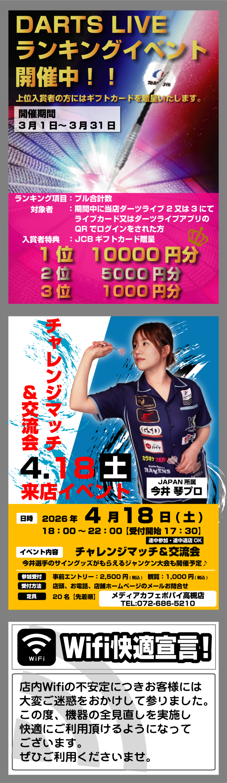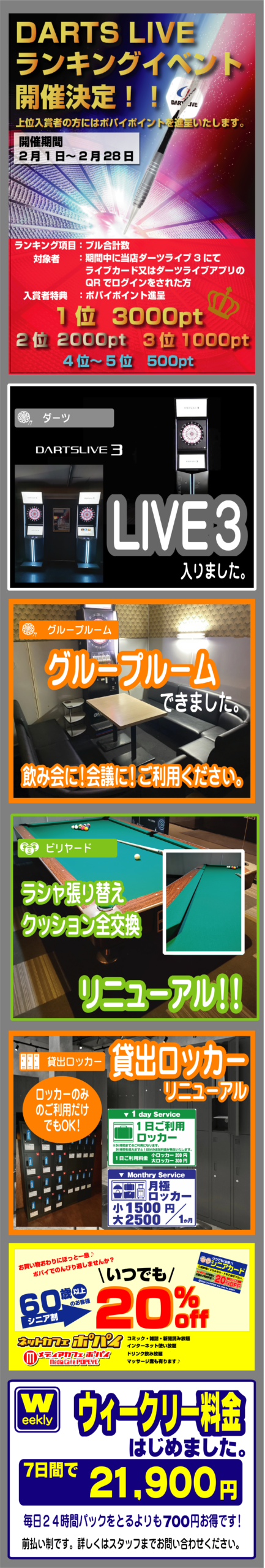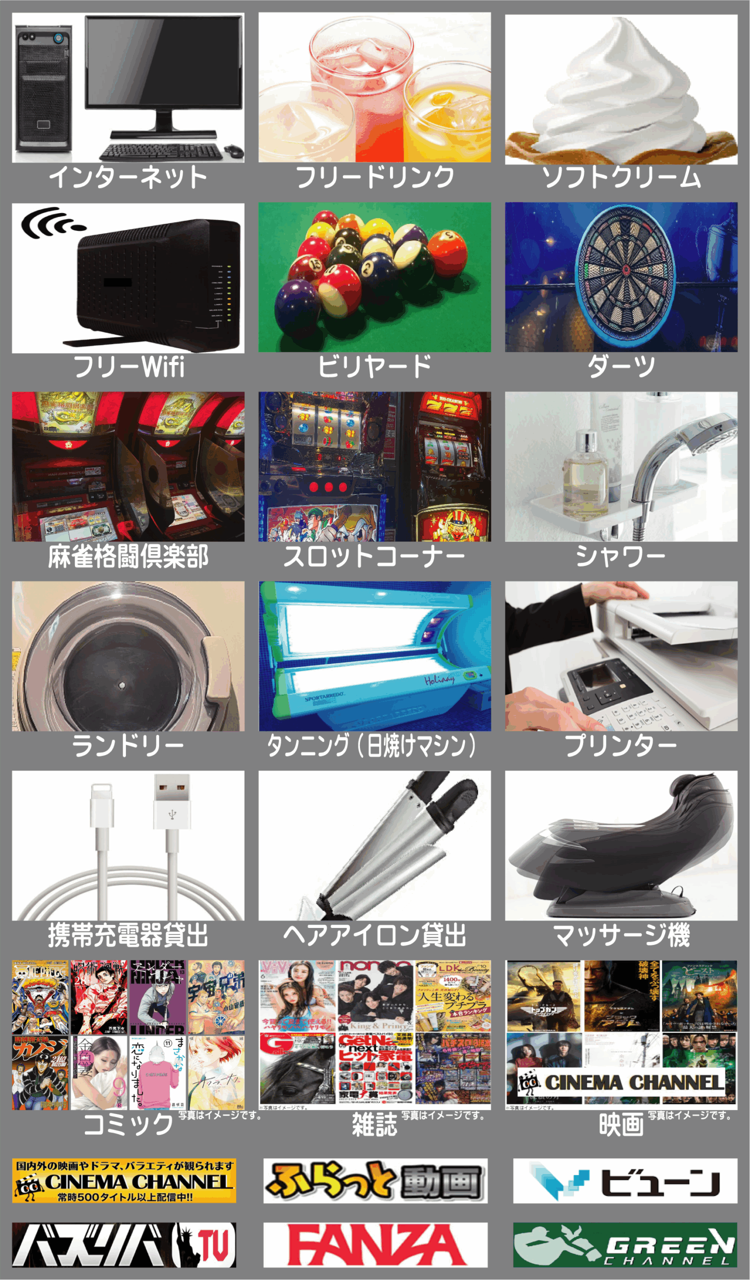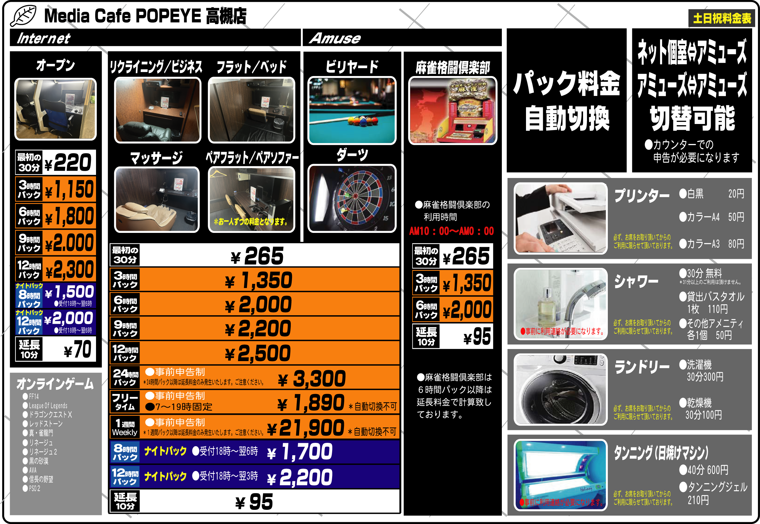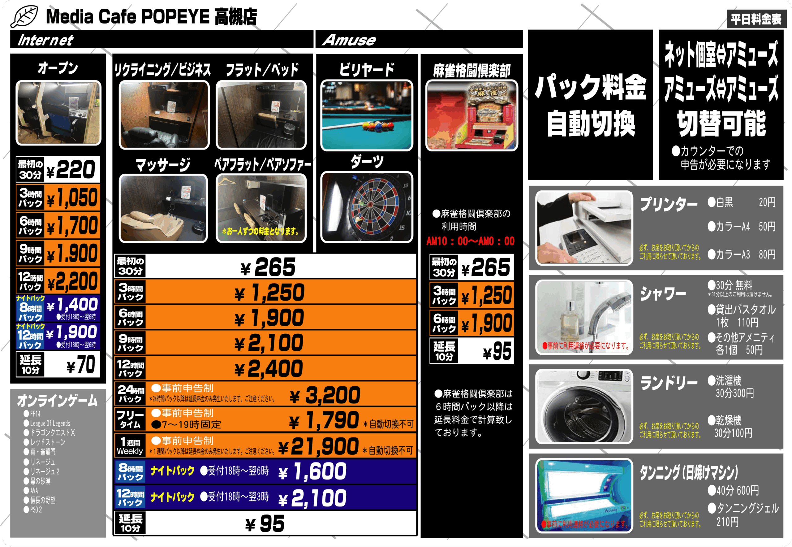 高槻市最大級のアミューズメント施設へようこそ!ネットカフェはもちろん、ビリヤード、ダーツ、スロットコーナー、麻雀格闘俱楽部、など多数のコンテンツをご用意致しております。また、少しの滞在でもご不便がございませんよう、シャワー、ランドリーなど充実した設備もご用意させて頂いてございます。周辺には飲み屋街やカラオケ施設が多くございます。お帰りの際にはぜひ当店にもお立ち寄りくださいませ。お待ち致しております。